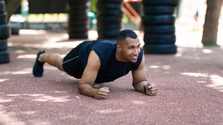 Strong black guy standing in elbow plank on road at park on sunny morning, blank space