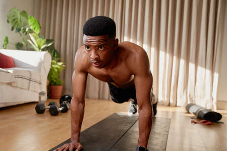 Determined sporty young man working out and trains at home. Fit boy doing push-ups exercises on the mat. Strong boy do gymnastics in the living room. Wellness, health, sport, gym, training concept