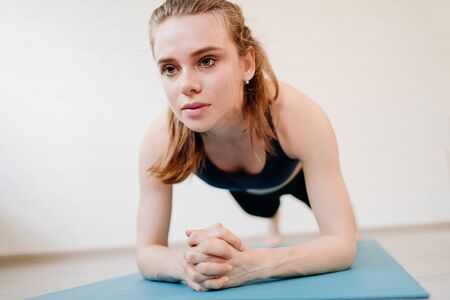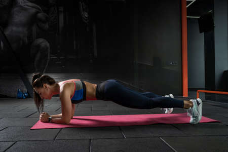 Focused young woman keeping plank pose on elbows in gym