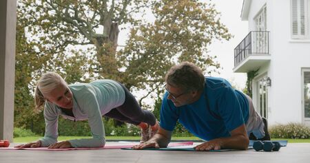 Side view of young brunette woman in grey activewear and her African American husband standing in plank on mats suring workout
