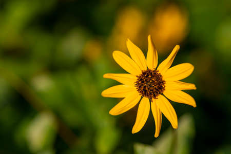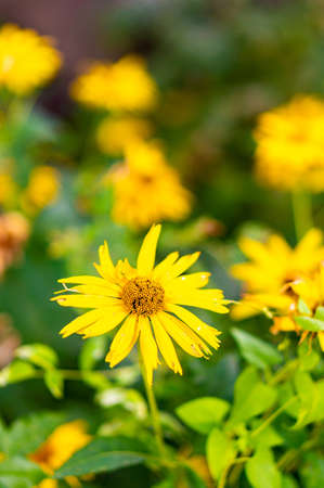 Melampodium Butter Daisy, mini sun flower, yellow flower Rudbeckia, Heliopsis helianthoides, blooming toward the sky, in shallow focus