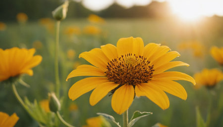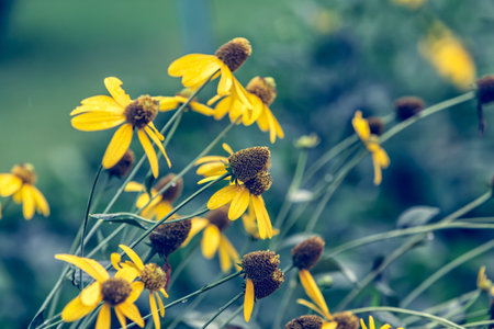 Field flowers in nature under sunlight. Floral closeup vintage and toning with retro filter effect. Warm gold and yellow colors over green foliage. Artistic nature