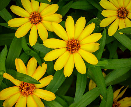 beautiful yellow flowers growing in the garden among green foliage background on a warm summer day in close-up