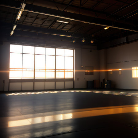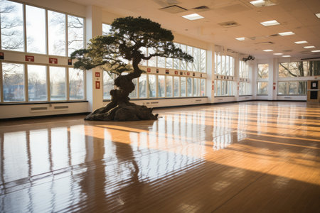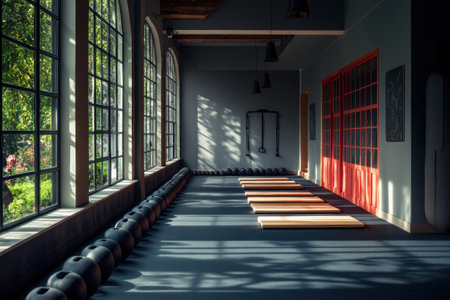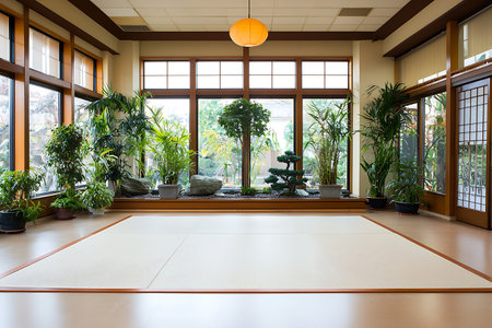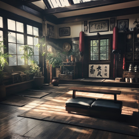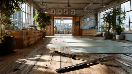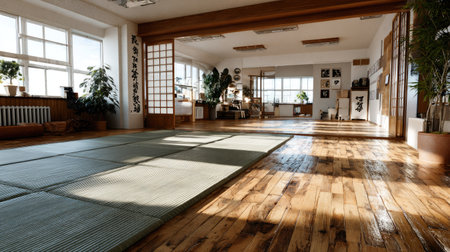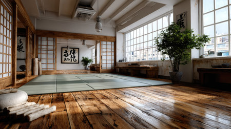 Experience the serene ambiance of a modern dojo interior bathed in natural light, featuring wooden elements, training mats, and lush greenery in an urban setting.