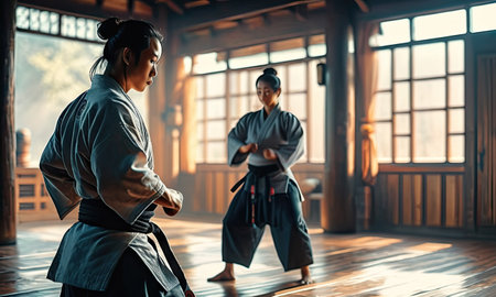 Master and student of Karate in combat in the serene Dojo., generative AI