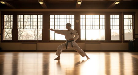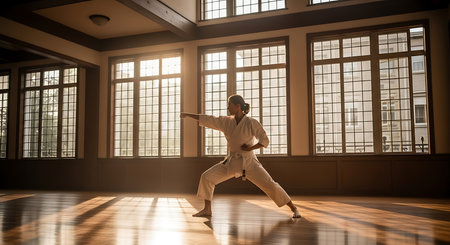 A dedicated martial artist practices karate in a traditional dojo with natural light filtering through.