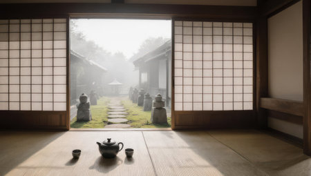 A serene Japanese tea room with shoji screens opening to a misty garden path and stone lanterns