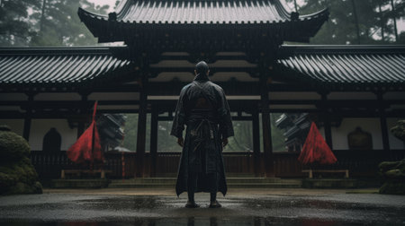 Japanese man in kimono standing in front of the temple in rainy day