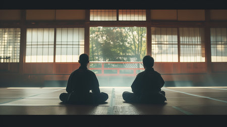 Two martial artists bow to each other before a match, sharp and respectful, while the dojo around them is a serene, unfocused space, emphasizing the moment of honor. --ar 16:9 Job ID: 3b9bec6d-aa74-4982-a241-5aa9c8386dfd