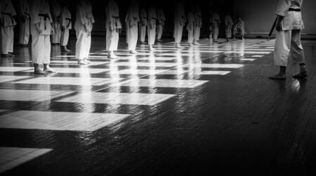 Mater gives new belts to his students in the hall.