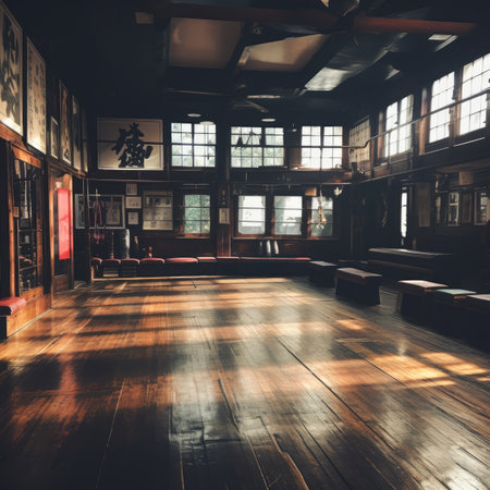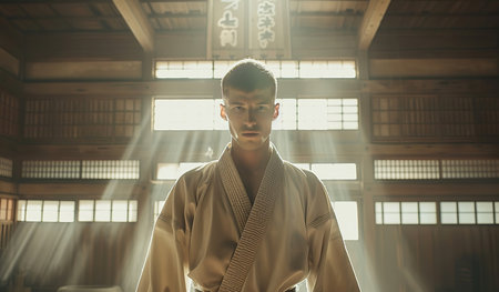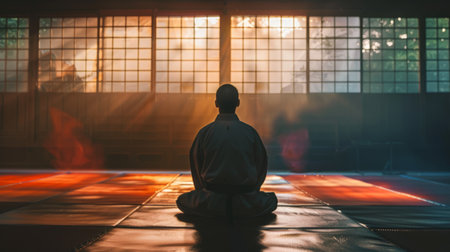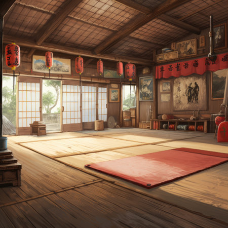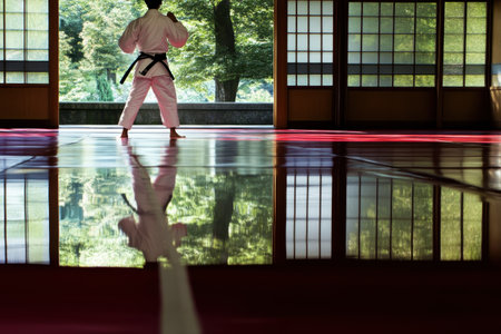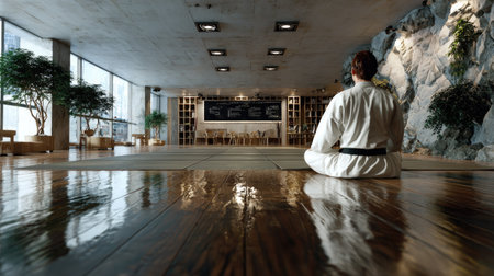 A peaceful interior of a martial arts dojo showcasing a dedicated practitioner in traditional attire, promoting focus and discipline in a serene environment.