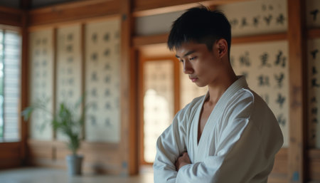 A focused young Asian male martial artist stands in a serene dojo, arms crossed and deep in thought. The tranquil atmosphere, highlighted by wooden walls and calligraphy, reflects his dedication and discipline.