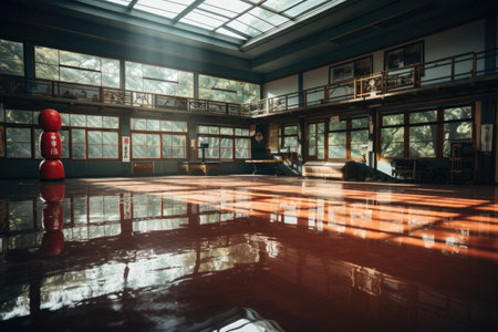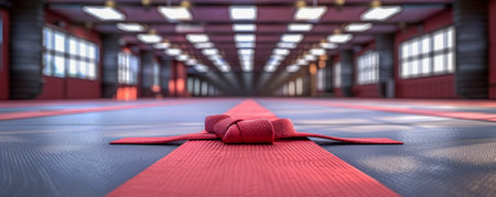 Immerse yourself in tranquility within a spacious dojo, where ample natural light caresses the serene ambiance Reflective floors mirror the serene atmosphere, fostering a deep sense of focus and calm At the heart of the hall, a vibrant red belt lies unfurled on the pristine mat, inviting practitioners to find their center and embrace the transformative power of martial arts AI Generative