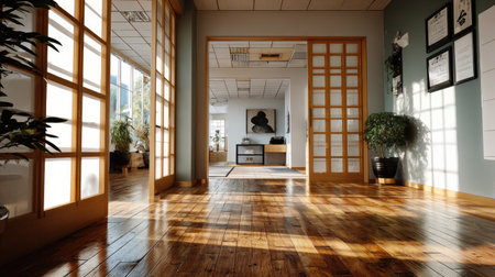 A bright office interior featuring a polished wooden floor illuminated by sunlight streaming through glass doors, enhancing a serene and inviting atmosphere.