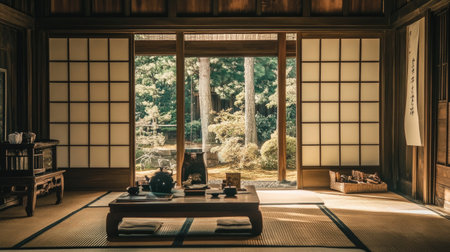 A serene Japanese interior showcasing a garden view. The traditional wooden construction and natural light create a calming ambiance perfect for relaxation.