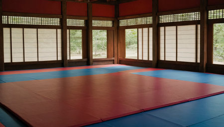 Japanese martial arts training room with red and blue martial arts mats.