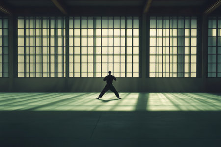 Silhouette of a martial artist practicing in a dimly lit gym with large windows, creating a dramatic atmosphere