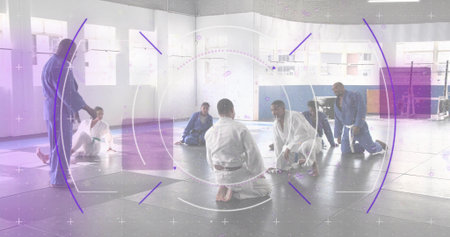 Man in kimono practicing martial art in gym. Mixed media