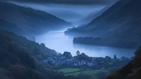 Misty Mountain Lake Village Scenic Autumn Landscape Photography fog sky blue view calm dark cold