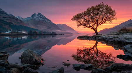 A picturesque scene of a lake reflecting the colors of a vibrant sunset. The composition showcases mountains, a lone tree, and a calm water surface. Warm hues dominate the sky and water, creating a serene ambiance. This image is suitable for various commercial uses, including website backgrounds and travel promotions.