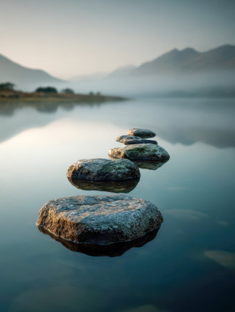 At dawn, gentle mist drapes distant mountain peaks as a peaceful shoreline reveals a winding trail of lush, mossy stones inviting quiet reflection over still waters.
