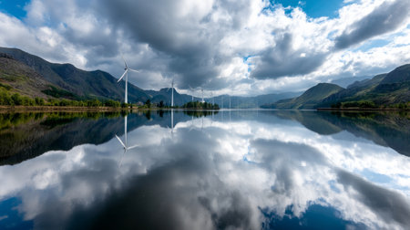 A lonely wind turbine standing on a flooded field, artistic surrealism. Near limes or a river. The concept of an alternative energy source, energy saving and careful attitude to our planet Earth