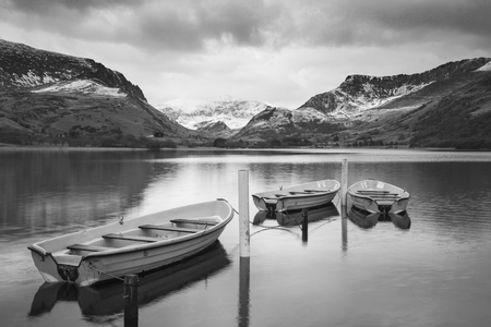 Black and white View of rowing boats on Llyn Nantlle in Snowdonia landscape at sunset