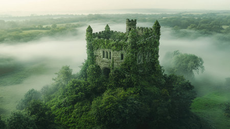 This captivating aerial image showcases an ancient castle ruin enveloped in lush greenery and soft morning mist, creating a tranquil and mystical atmosphere.