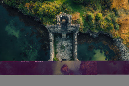 This stunning aerial shot showcases an abandoned stone castle nestled amidst nature, highlighting its intricate architecture and overgrown surroundings.