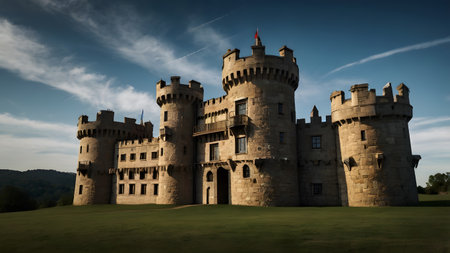 This image features a majestic medieval castle atop a scenic hillside, flanked by robust stone walls and surrounded by lush greenery, beneath a bright blue sky interspersed with clouds. AI generated image