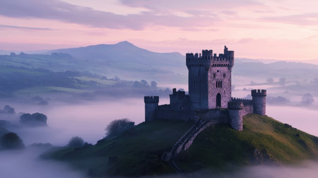 A majestic stone castle stands alone on a grassy hill, enveloped in mist and fog, creating a serene and mysterious atmosphere in nature.