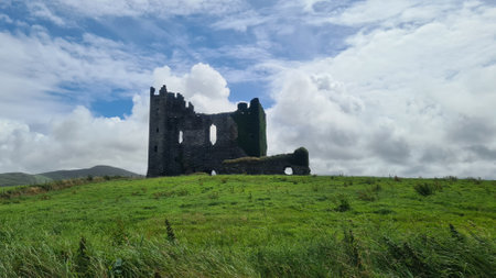 Aerial view of the Minard Castle situated on the Dingle Peninsula in Ireland