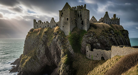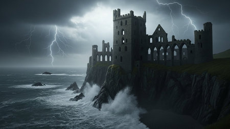 AI Generated. Seaside castle ruin medieval coastline stone walls cracks moss