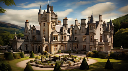 A castle sitting on top of a lush green hillside. Generative AI image.