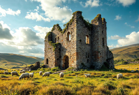 Majestic ruins rise from sprawling fields, surrounded by grazing sheep. The vibrant greens contrast with the stone structure, while clouds create a captivating backdrop in the golden hour.