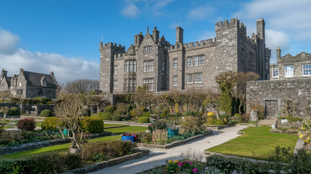 A scenic view of a historic stone castle set against a brilliant blue sky, featuring beautifully manicured gardens and vibrant greenery, perfect for travel inspiration.