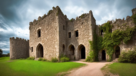 Abandoned ruins of an old castle in a cloudy day.