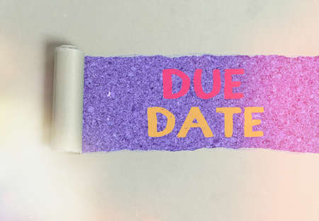 Handwriting text Due Date. Conceptual photo the day or date by which something is supposed to be done or paid Rolled ripped torn cardboard placed above a wooden classic table backdrop