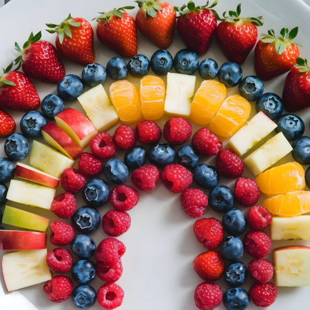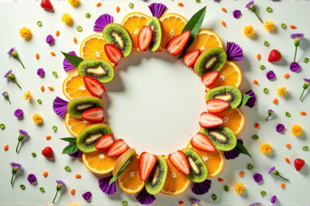 Colorful fruit and flower arrangement in circular pattern on white background. That the image is generated using AI.