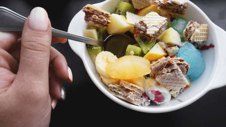 Close up desert with hand. fresh fruit and ice cream. Mixed Fruit With with waffle and fruit ice on black background
