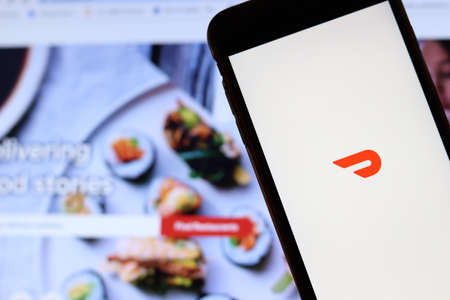 Los Angeles, California, USA - 21 November 2019: Doordash logo on phone screen with icon on laptop on blurry background, Illustrative Editorial.