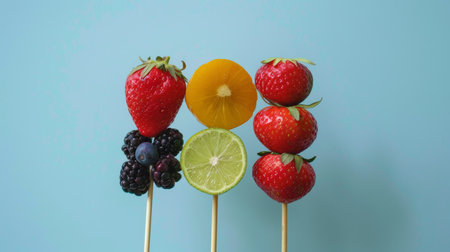 Healthy fruits on sticks. Strawberries, strawberries, blueberries, blackberries, lime, lemon. On a blue background