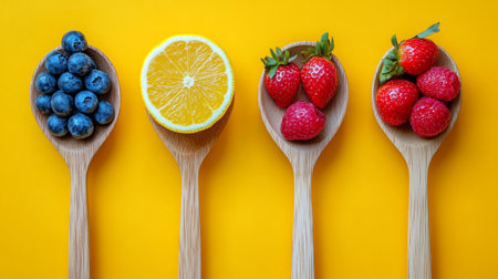 Vibrant arrangement of blueberries, lemon slices, strawberries, and raspberries on wooden spoons on a yellow backdrop.