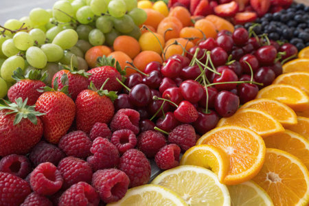 A vibrant collection of fresh fruits features strawberries, cherries, grapes, oranges, and blueberries on a display. Perfect for a summer gathering or a health focused event.