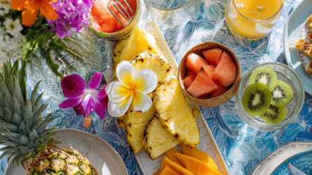 Tropical fresh fruit breakfast spread with pineapple, watermelon and kiwi, perfect for healthy summer dining and vacation resort hospitality experiences.