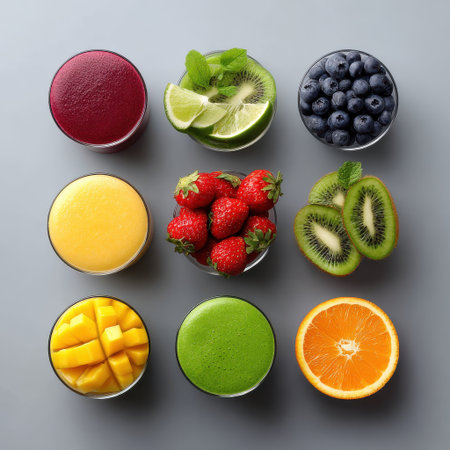 Colorful fresh fruit and smoothie bowls with strawberry, kiwi, orange, mango, blueberry, and lime slices arranged on gray surface