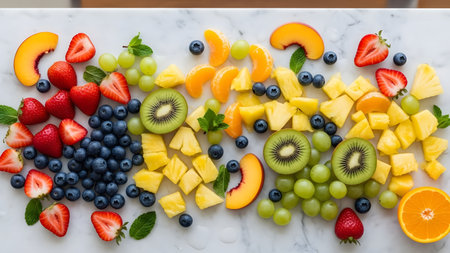 Fruit salad with strawberries, blueberries, pineapple, kiwi, melon and mintle background