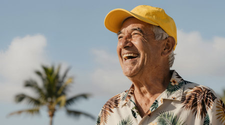 Portrait of happy senior man wearing a yellow hat and looking at the camera