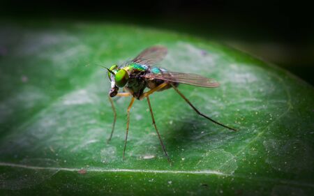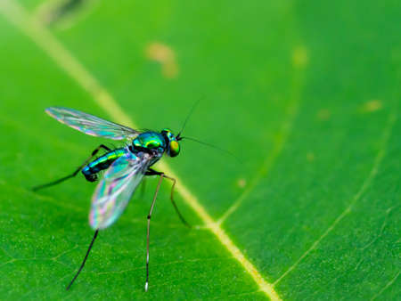 Close up Long legged fly stand on green leaves, Beautiful green fly in nature