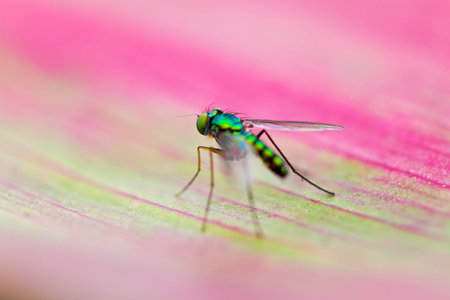 Beautiful macro of a green fly on a pink leaf in Madagascar